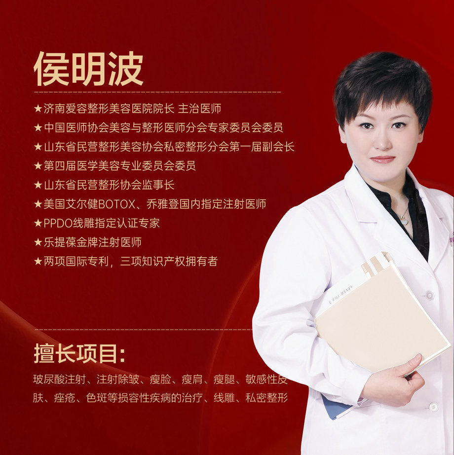 侯明波擅长项目:玻尿酸注射、注射除皱、瘦脸、瘦肩、瘦腿、敏感性皮肤、痤疮、色斑等损容性疾病的治疗、线雕、私密整形